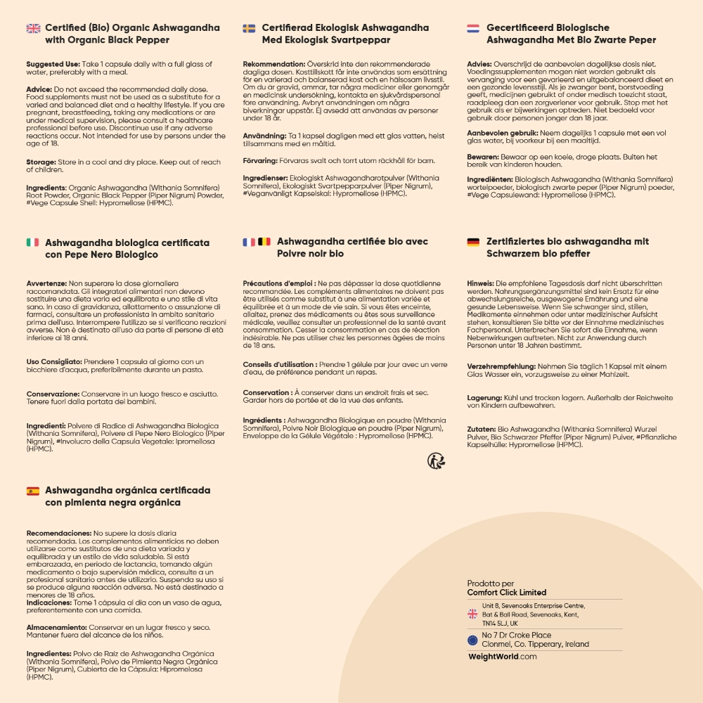 L'Ashwagandha, nota anche come ginseng indiano, è un'erba che è stata una pietra miliare della medicina ayurvedica per migliaia di anni. Grazie alle sue potenti proprietà naturali, è diventata anche un integratore molto venduto. Le capsule di Ashwagandha hanno visto un enorme aumento di popolarità grazie alle loro proprietà adattogene, ovvero di supporto all’organismo contro lo stress. La formula di WeightWorld è composta da 605 mg di Ashwagandha biologica per capsula e arricchita con pepe nero bio per aumentarne la biodisponibilità.