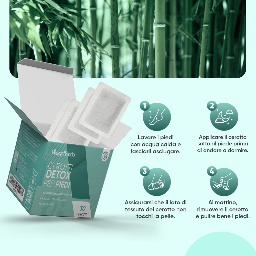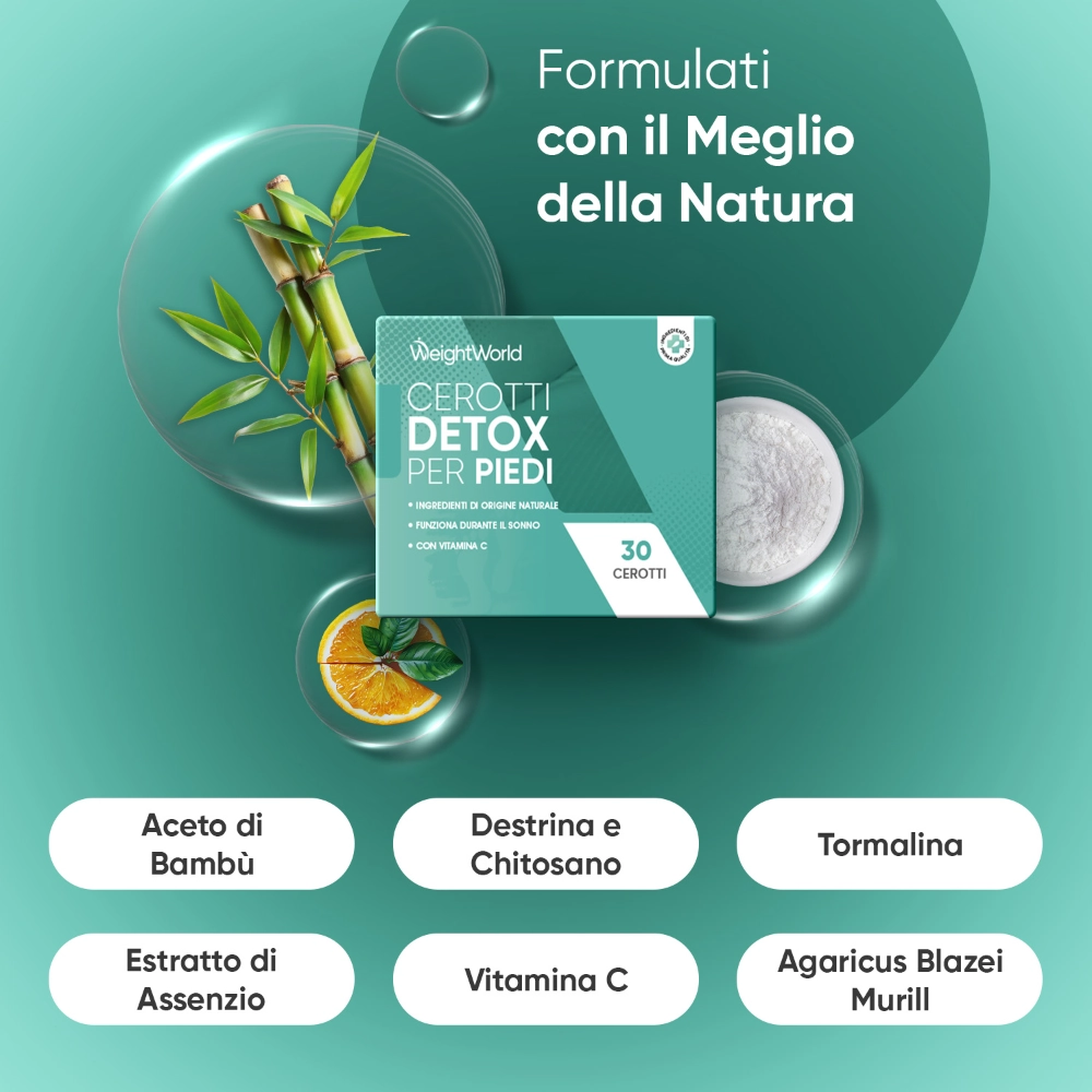 Combinando idee occidentali e orientali sulla salute e la disintossicazione, WeightWorld ha creato i Cerotti Detox Piedi, un metodo di purificazione dell’organismo davvero unico nel suo genere! Basati su un sistema innovativo ispirato all'agopuntura, alla riflessologia e alla detossificazione, questi cerotti utilizzano i loro ingredienti naturali per contribuire all’espulsione delle tossine e delle impurità attraverso le piante dei piedi.