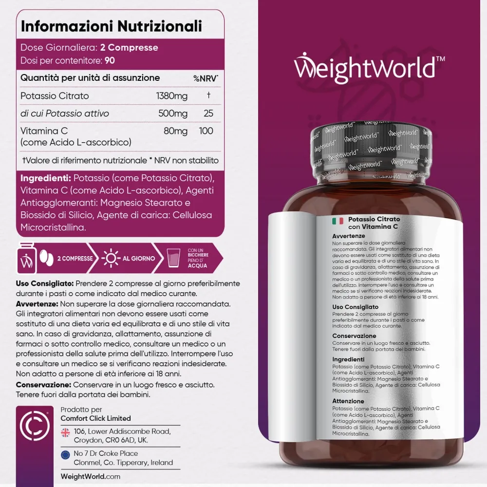 Il Citrato di Potassio con vitamina C è un integratore naturale che può aiutare a regolare i livelli di potassio del tuo corpo, contribuendo al benessere generale. Quando si ha una carenza di potassio o ipokaliemia, questa può manifestarsi con molti sintomi fastidiosi. Se stai sperimentando dolori muscolari, intorpidimento, costipazione, frequenti gonfiori o affaticamento a causa di bassi livelli di potassio, la formula forte di Weightworld può aiutarti! Inoltre, la vitamina C contribuisce a mantenere la salute della pelle, di denti e gengive e favorisce l’assorbimento di ferro e la cicatrizzazione delle ferite. Queste compresse di Citrato di Potassio con vitamina C ,facili da assumere, possono essere prese in movimento, supportando funzioni corporee critiche come il sistema nervoso, il sistema immunitario, la pressione sanguigna e la regolazione dei fluidi corporei per alleviare gli effetti di cui sopra.
