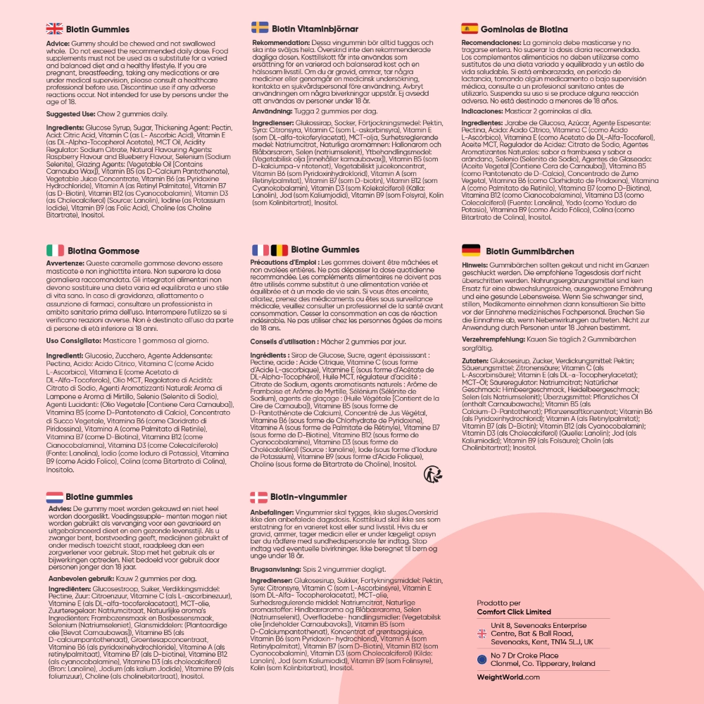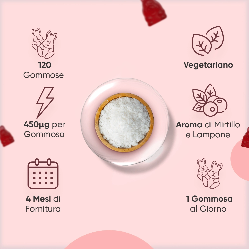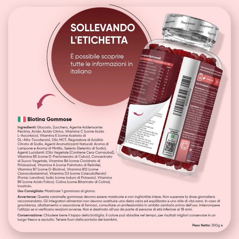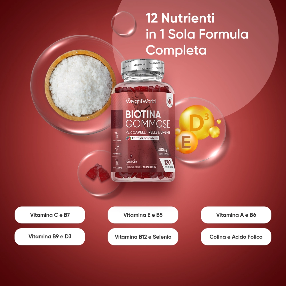- 900 µg di biotina al giorno (2 gommose da 450 µg ciascuna)