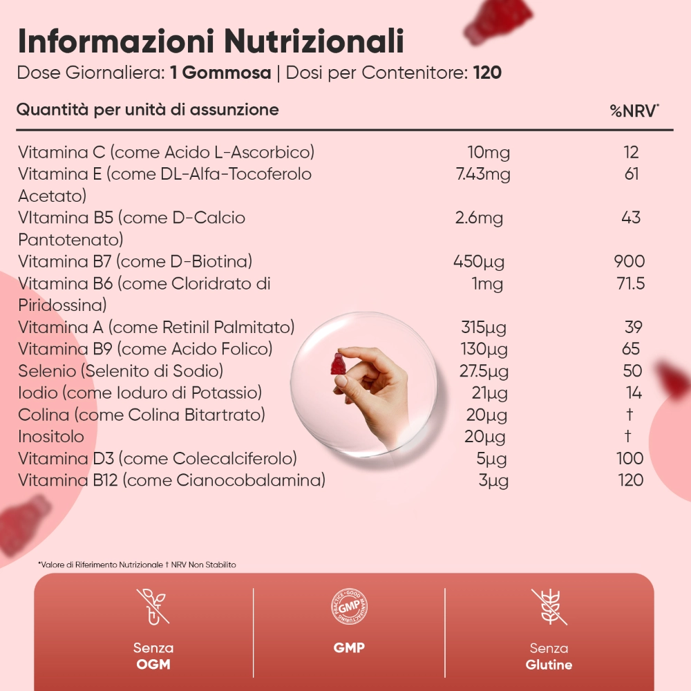 - Formula 13-in-1: Biotina + Vitamine A, C, D, E, B5, B6, B9, B12 + Selenio, Iodio, Colina, Inositolo