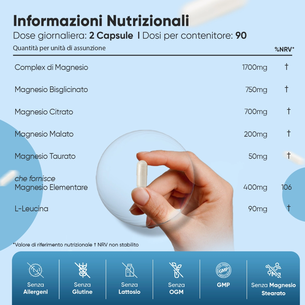 - Dosaggio con 400 mg di magnesio e 90 mg di Leucina