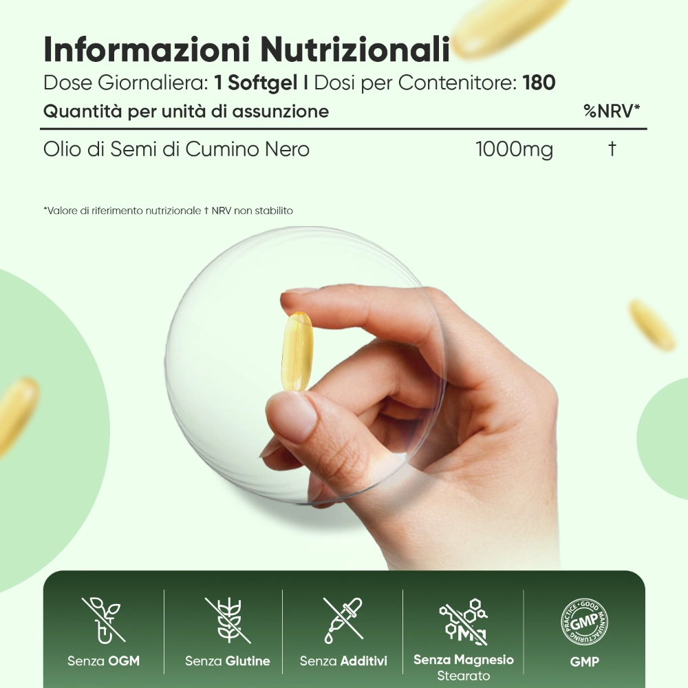 - Formula da 1000 mg di olio di semi di cumino per softgel, la dose ottimale per il tuo corpo