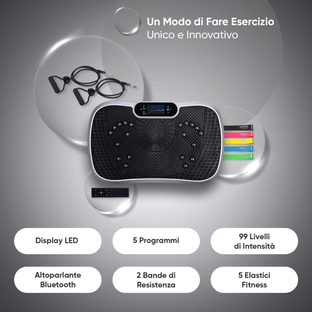 Nella scatola troverai la Pedana Vibrante, il cavo di alimentazione, il telecomando, 2 elastici con manubri e gancio da attaccare alla pedana per gli allenamenti di braccia, spalle e petto, 5 elastici per allenamento a corpo libero e il manuale di istruzioni.