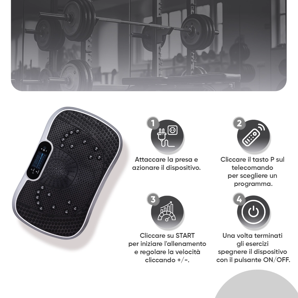 Questo speciale dispositivo rende il tuo allenamento ancora più efficace grazie alla sua tecnologia. Mentre ti alleni, infatti, la vibrazione della pedana contribuisce a tonificare e rafforzare i muscoli che stai sforzando e quelli a riposo. Per questo, anche solo stare in piedi sulla pedana risulta benefico per i muscoli delle gambe. Puoi regolare la vibrazione in base alle tue esigenze con il pratico telecomando.