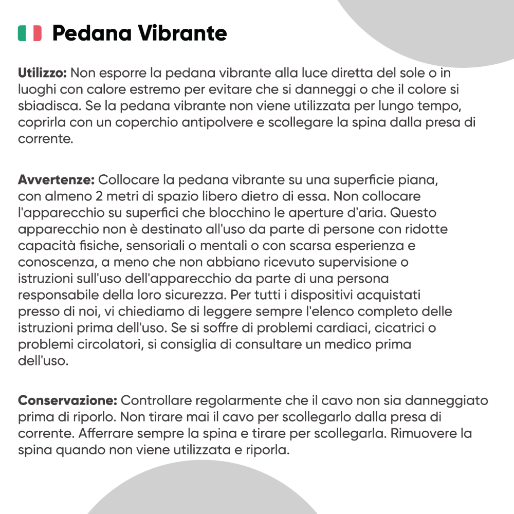 Con questa speciale Pedana potrai allenare tutto il corpo con semplicità. Puoi salire in piedi sulla pedana e svolgere una sessione di squat (piegamenti sulle gambe), fare flessioni poggiando le mani sulla Pedana, o ancora sfruttare gli elastici e allenare bicipiti, tricipiti e spalle. Gli utilizzi sono vari e ogni allenamento è rafforzato dalla vibrazione prodotta dal dispositivo.