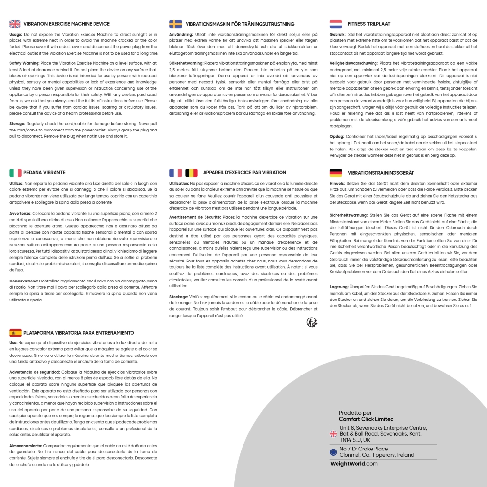 La Pedana Vibrante WeightWorld è un macchinario avanzato di allenamento progettato per l'uso domestico. Questo sorprendente dispositivo per esercizi utilizza le vibrazioni in tutto il corpo per stimolare i muscoli ed è particolarmente benefica per addominali, gambe, glutei, fianchi, schiena e collo. Con le stimolazioni, puoi facilmente ottenere molteplici benefici tra cui: tonificare i muscoli, combattere il grasso in eccesso e sostenere l'equilibrio generale del corpo. Ogni sessione richiede solo 20 minuti al giorno.