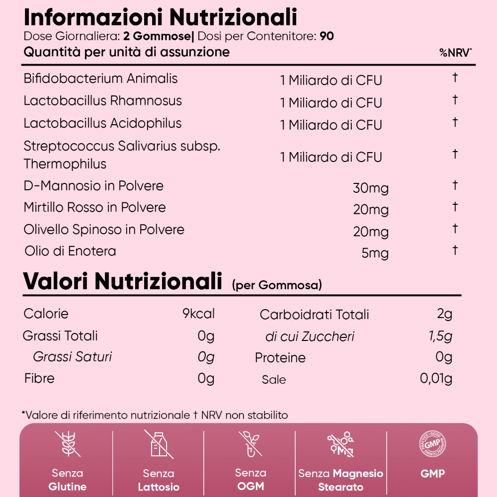 Ogni dose (2 gommose) apporta 4 Miliardi di CFU da 4 ceppi probiotici diversi, più una selezione di ingredienti pensati specificamente per le esigenze femminili: D-Mannosio, Mirtillo Rosso, Olivello Spinoso e Olio di Enotera. Una formula completa che lavora su più fronti: intestino, vie urinarie e benessere psico-fisico.