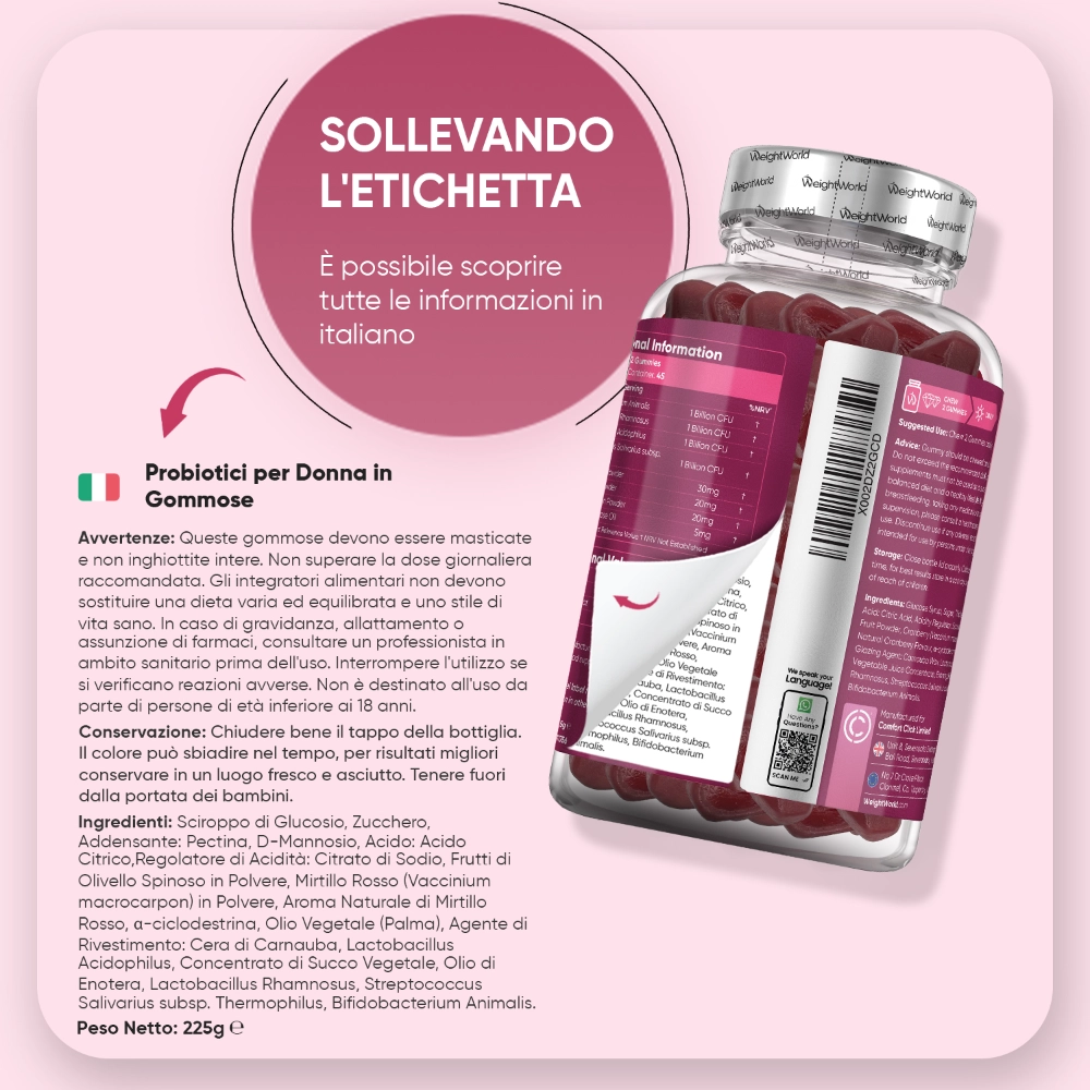 Le Gommose Probiotiche per Donna WeightWorld sono una coccola quotidiana pensata per il benessere delle donne. Morbide, golose, al gusto di mirtillo rosso: prendersi cura della propria flora intestinale diventa un piccolo momento di piacere, non l'ennesima cosa da ricordare. Perché il benessere merita attenzione, ma anche leggerezza.