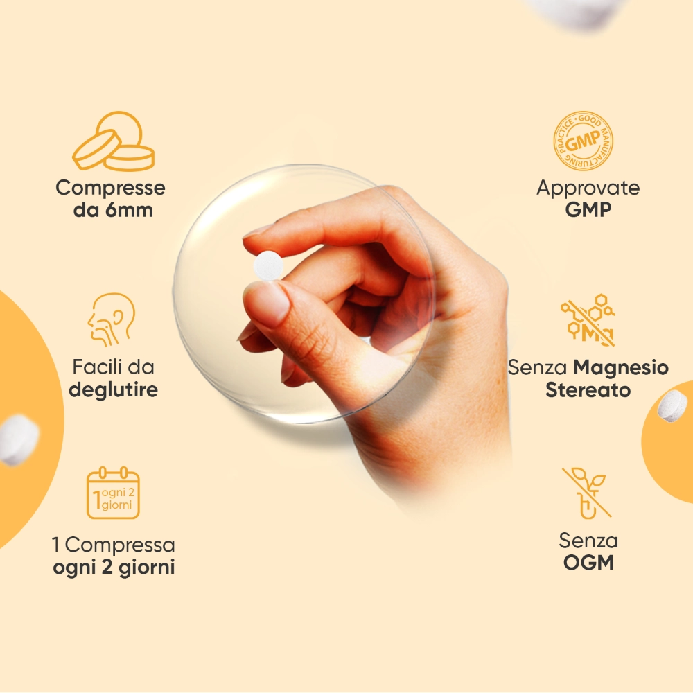 Basta assumere una compressa ogni 2 giorni, preferibilmente con un pasto ed un bicchiere d’acqua. Si consiglia di mantenere sempre lo stesso orario di assunzione per maggiore costanza.