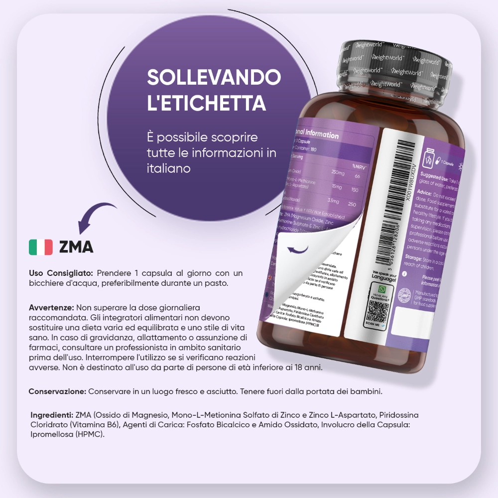 ZMA è un integratore che combina insieme Zinco, Magnesio e Vitamina B6. Sta diventando sempre più popolare grazie alle sue proprietà energizzanti, rinforzanti e calmanti. Questi tre ingredienti, infatti, lavorano in sinergia per aiutarti a trovare maggiore relax quando ne hai bisogno, ma anche per il recupero muscolare post-allenamento. WeightWorld ha sviluppato questo integratore 3 in 1 per offrirti tutti i benefici dei 3 ingredienti dosati al meglio in una sola capsula. Ritrova le energie di cui hai bisogno con le Capsule ZMA di WeightWorld!
